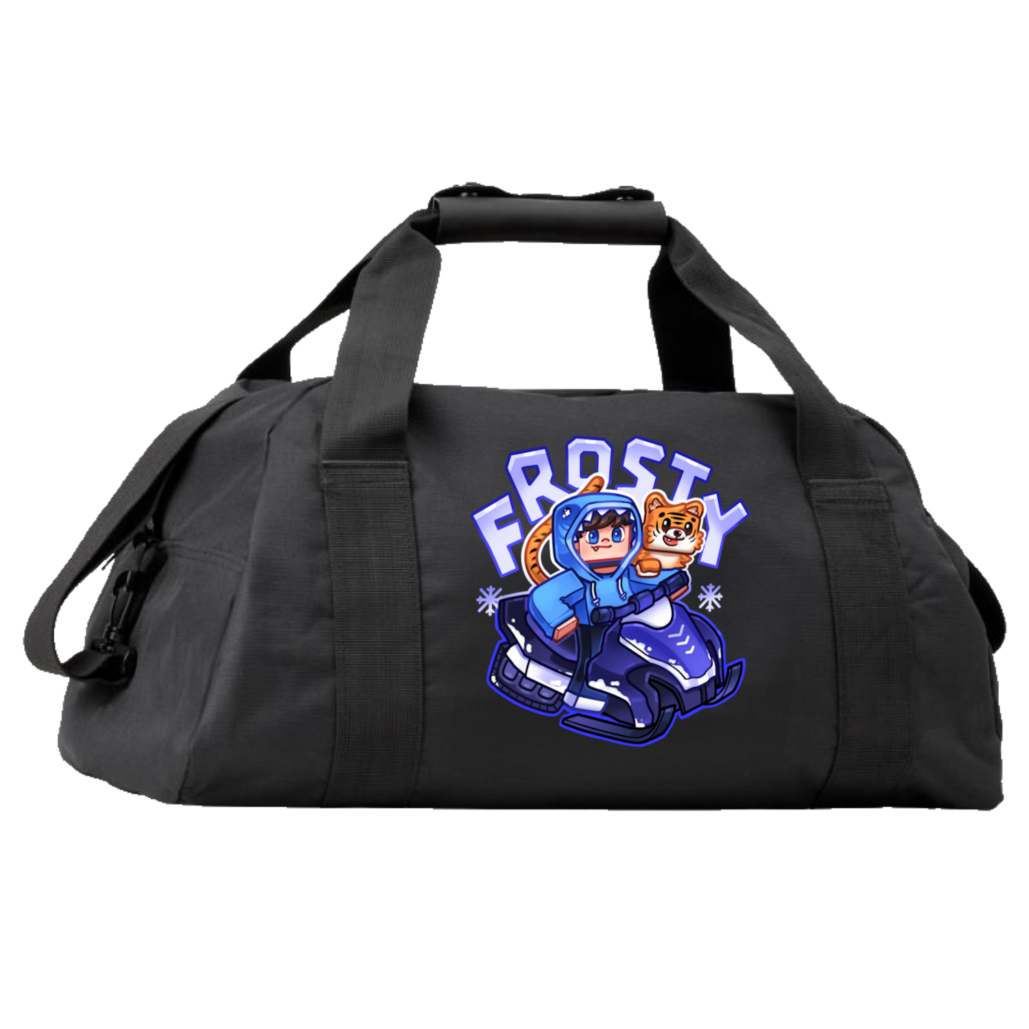 Designet viser Frosty på sin snescooter sammen med sit ikoniske tiger-kæledyr 🐯❄️ Et motiv der udstråler action, sjov og den velkendte Frosty-stemning.